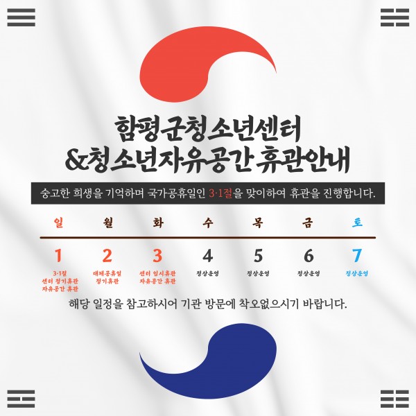 숭고한 희생을 기억하며 국가공휴일인 3·1절을 맞이하여 휴관을 진행하오니