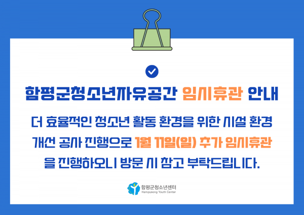 01월 10일(토) ~ 01월 11일(일) 2일간 청소년자유공간 이용이 일시적으로 중단 됩니다. 청소년 여러분들의 양해를 부탁드립니다.