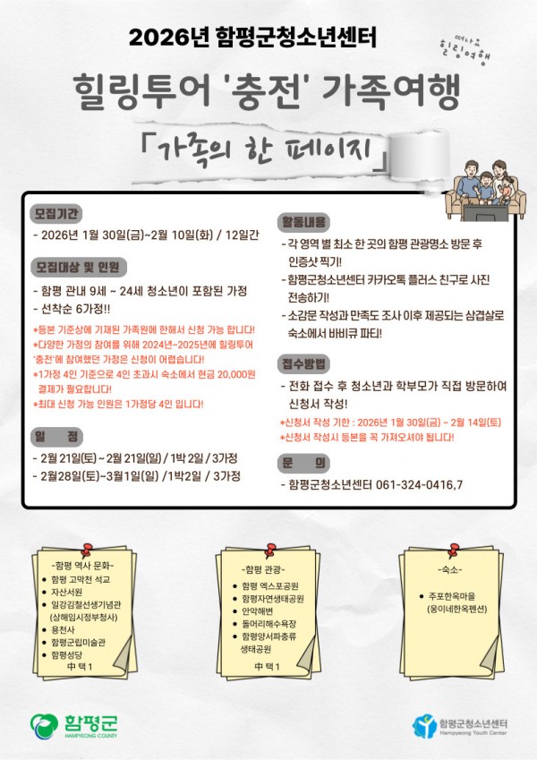 - 2026년 함평군청소년센터 힐링투어 '충전' 가족여행 "가족의 한 페이지" 참가자 모집!