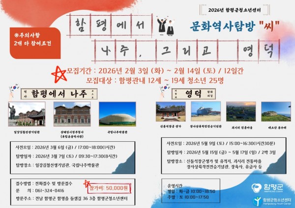 저희 센터에서 2026년 문화역사탐방 "씨" 함평에서 나주, 그리고 영덕 참가자를 모집하고자 합니다!