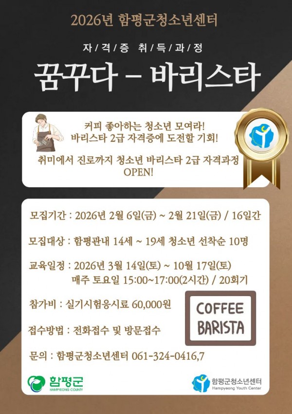 - [모집]2026년 함평군청소년센터 꿈꾸다-바리스타 자격과정 참가자 모집