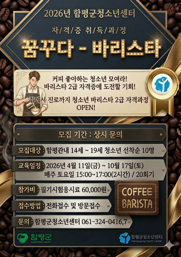 - [모집]2026년 함평군청소년센터 꿈꾸다-바리스타 자격과정 참가자 모집